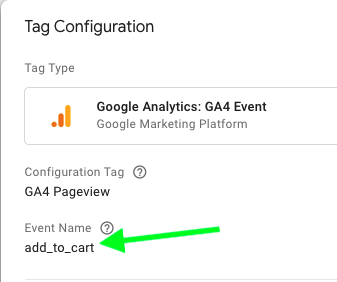 - For Event Name, enter ‘add_to_cart’ into the Event Name field.