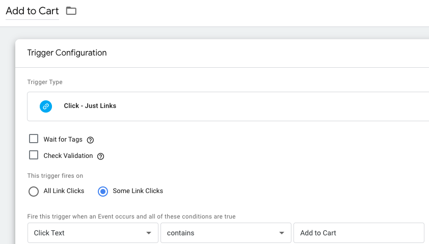 As it stands now, this trigger will fire in every instance on the entire website a link is clicked with the text ‘Add to Cart’. You can be a little more specific with this trigger if you only want to track a subset of pages. For example, you can add a condition where Page Path includes the directory where your product pages live.