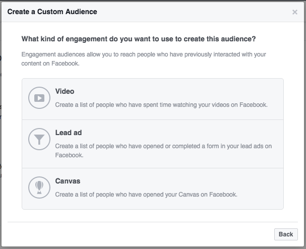 Choosing the “engagement on Facebook” option will allow you to create custom audiences based on three types of engagement: